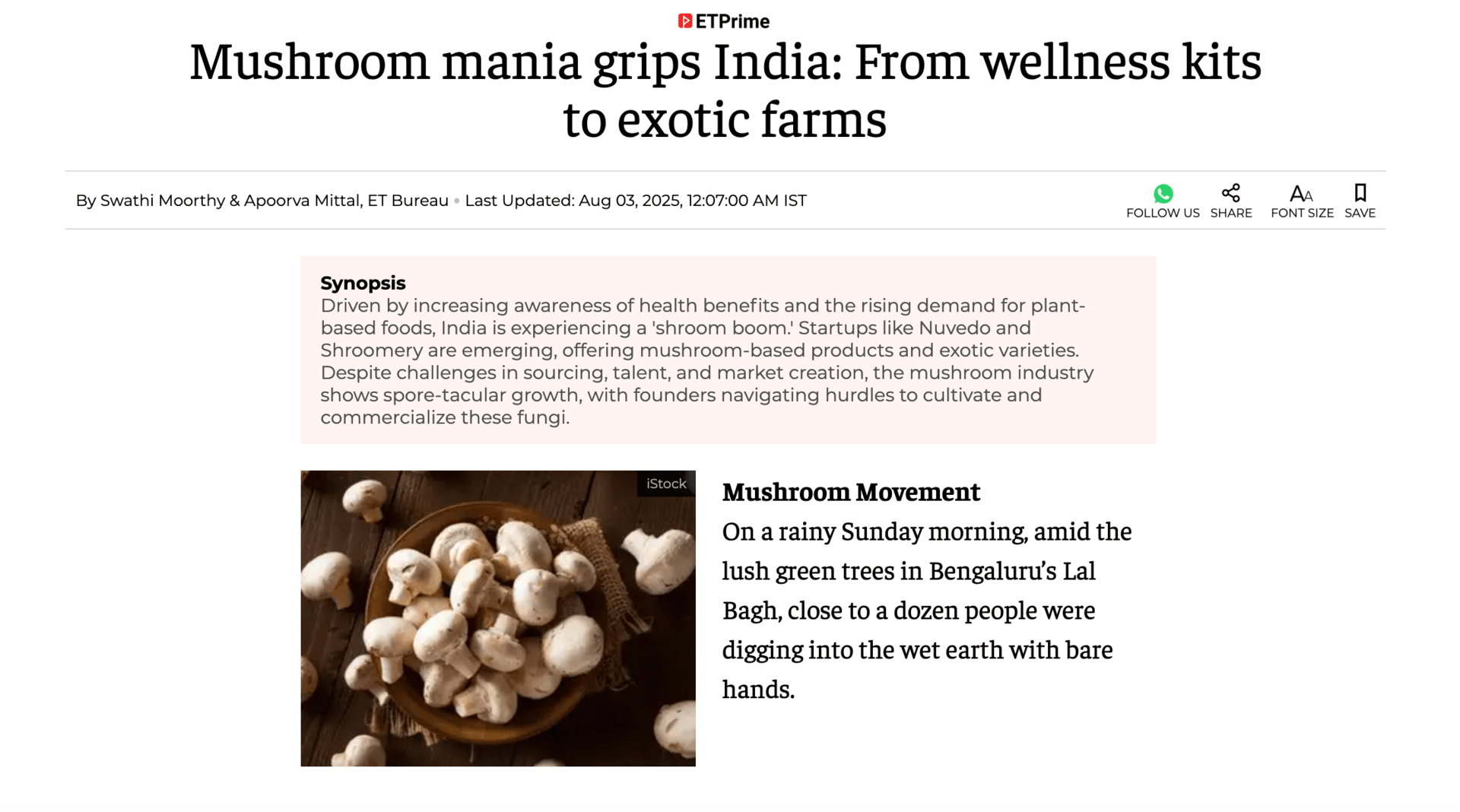 Our friends at India’s 🇮🇳 leading mushroom startup Nuvedo were featured in The Economic Times this week.