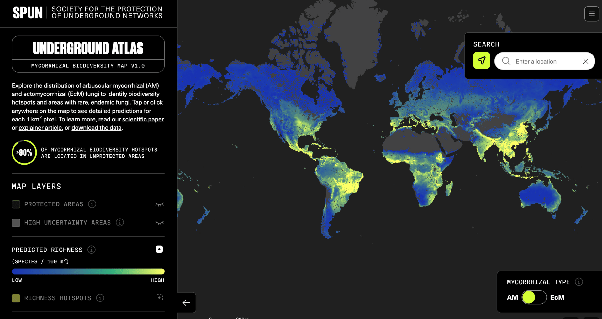 The Society for Protection of Underground Networks has created the first high-resolution maps to predict mycorrhizal fungal biodiversity across the planet by using more than 2.8 billion fungal DNA sequences derived from soil samples collected across 130 countries. Check out their interactive map here