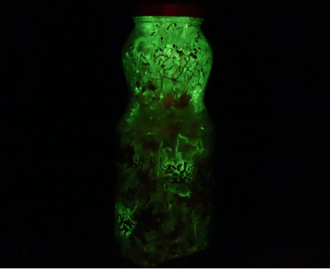 “Inside each container lives a carefully cultivated substrate fully colonized by Panellus stipticus, a remarkable bioluminescent fungus known for its soft, natural glow. Over time, the mycelium forms primordia and eventually small fruiting bodies — and when conditions are right, they emit a gentle green light that feels almost magical.”