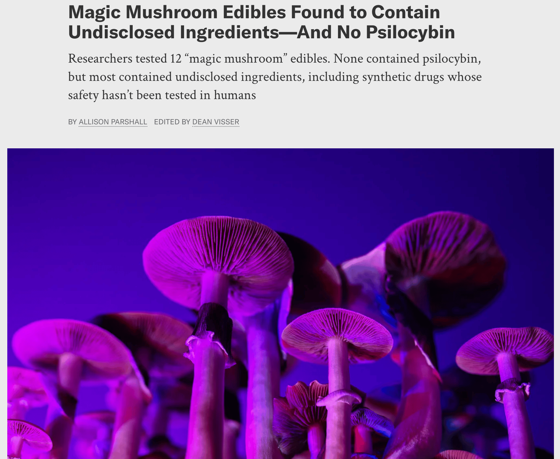 “Even when a product does actually contain psilocybin, the labeling is often completely misleading. A product labeled as 4,000 mg is typically just 4 grams of dried mushroom material—without any indication of the actual psilocybin content. This creates a dangerous and confusing disconnect, as weight alone has nothing to do with potency. True safety and precision in psychedelic medicine require accurate labeling in milligrams of active compounds, not arbitrary dry weight.