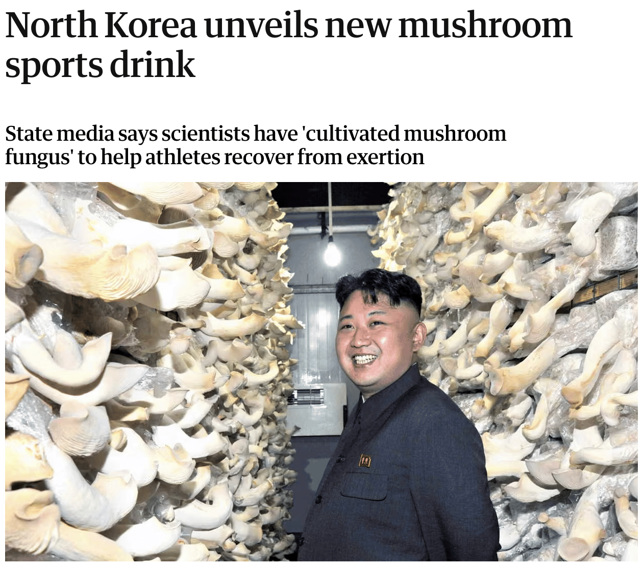 North Korea 🇰🇵 even has a ‘mushroom sports drink’ formulated to be “very effective in enhancing physical ability of sportspersons and recovering from their fatigue” as reported by The Guardian in 2014.